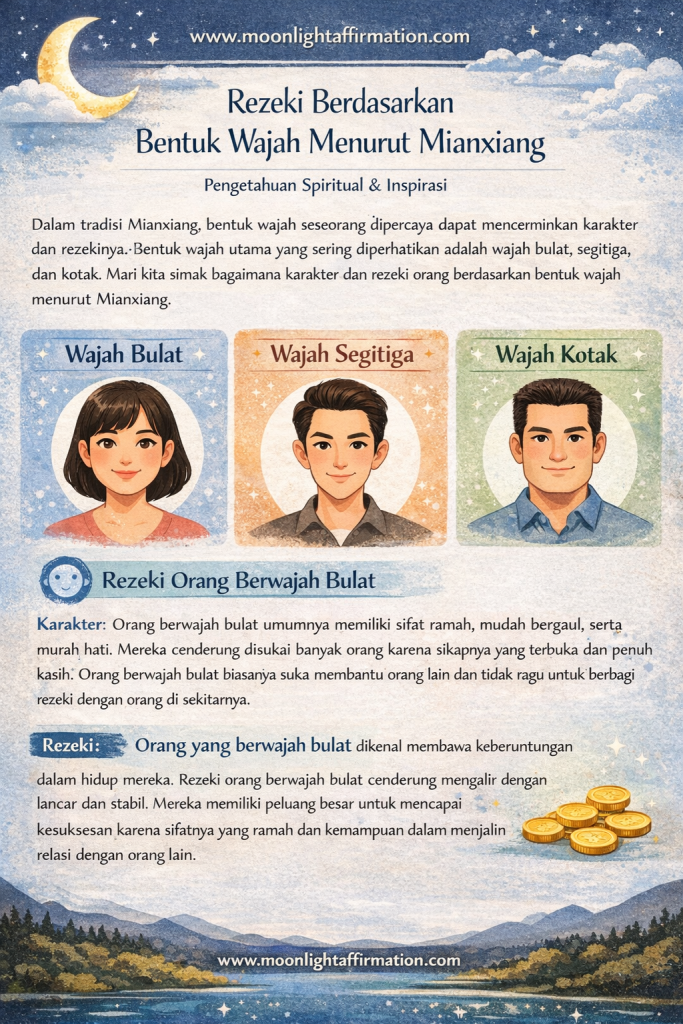 Setiap bentuk wajah menyimpan potensi rezeki, karakter tersembunyi, serta pola kehidupan yang unik. Namun, analisa yang akurat dalam ilmu Mianxiang (Chinese Face Reading) tidak hanya melihat bentuk wajah secara umum, tetapi juga memperhatikan detail seperti: